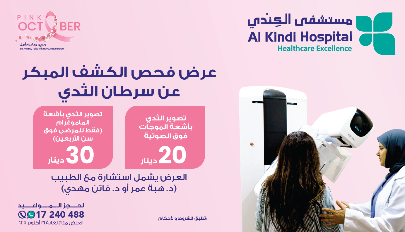 تزامناً مع شهر التوعية بسرطان الثدي، مستشفى الكندي يقدم من أجلكِ عرض الفحص الطبي للكشف عن سرطان الثدي